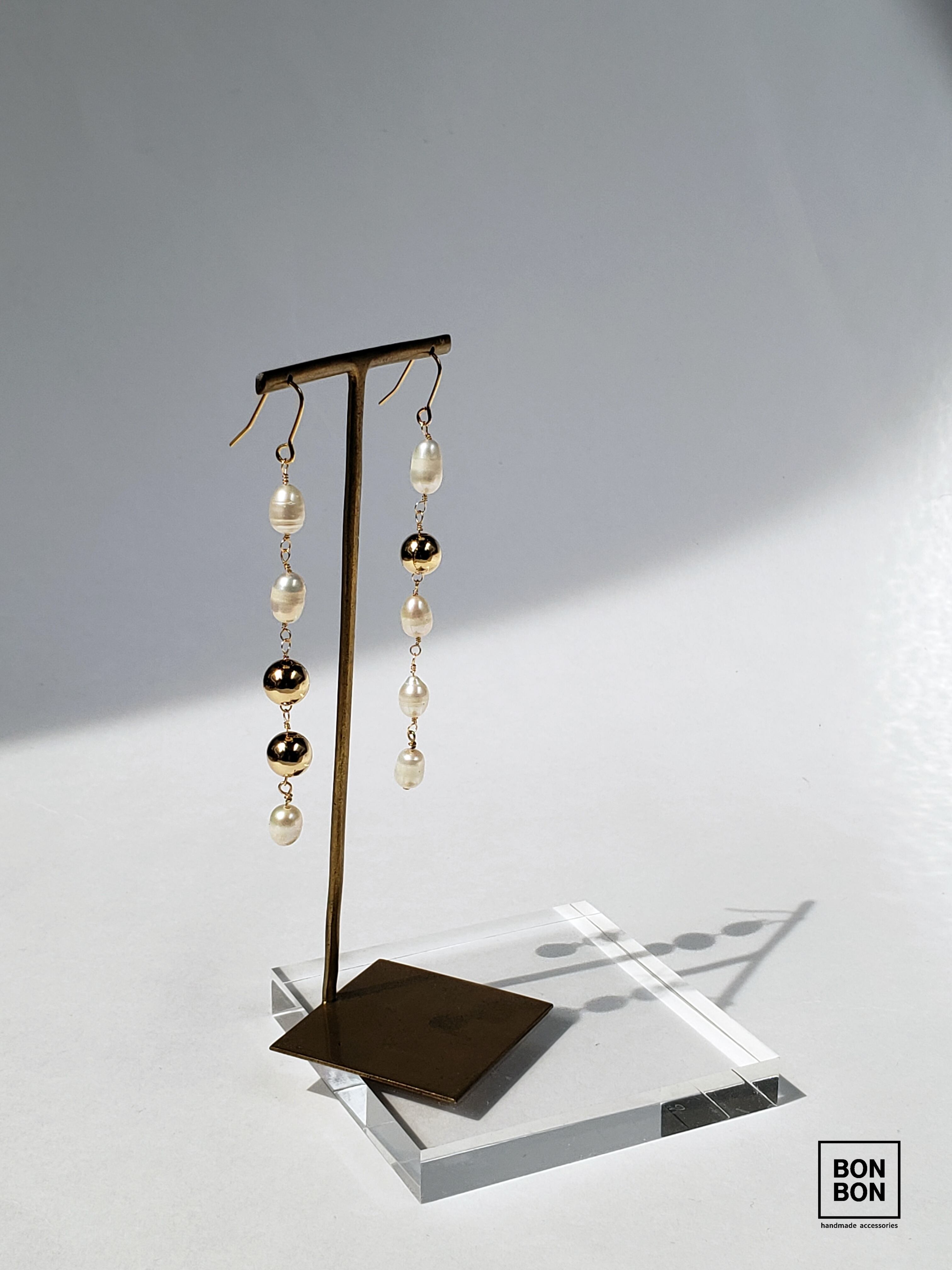 淡水パールとゴールドをミックスさせた揺れるピアス/イヤリング 左右で異なるアシンメトリーなデザインが特徴 全長:約7.5㎝ ピアス/イヤリング
